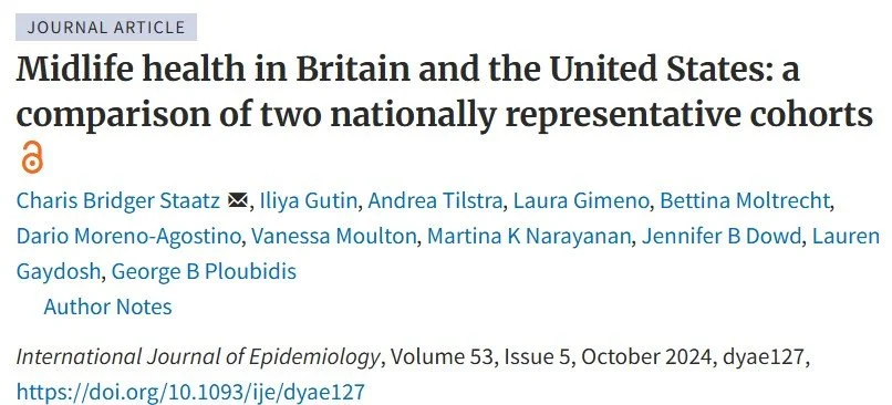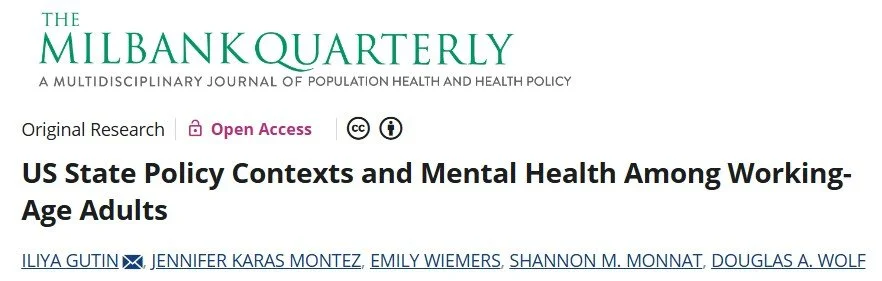 More recently, my work has turned to the structural and political contexts that shape population health. A series of collaborative projects — using county- and state-level data spanning several decades — examines how state policy environments and local economic conditions jointly contribute to geographic disparities in working-age mortality, with papers forthcoming in Demography and the Russell Sage Foundation Journal. Related work published in The Milbank Quarterly documents the association between state policy contexts and mental health among U.S. working-age adults from 1993 to 2022. Complementing this U.S.-focused work, a collaboration with researchers at Oxford, UCL, and UNC uses the U.S. Add Health and British BCS70 cohorts to compare educational gradients in health at midlife across the two countries — asking why lower education is particularly harmful to health in the United States. This work appears in the International Journal of Epidemiology, with a more in-depth analysis forthcoming from the Russell Sage Foundation.